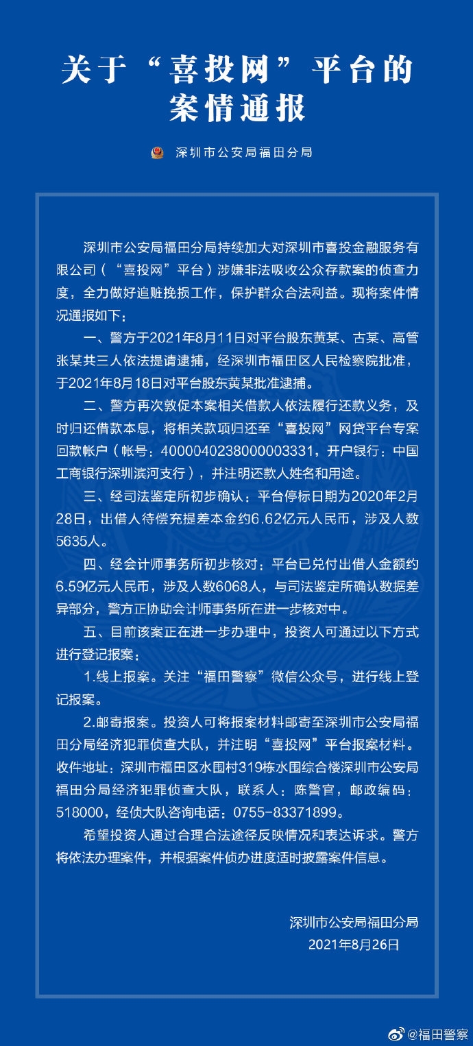 央视网消息:据“福田警察”微博消息,8月26日,深圳市公安局福田分局发布关于“喜投网”平台的案情通报。