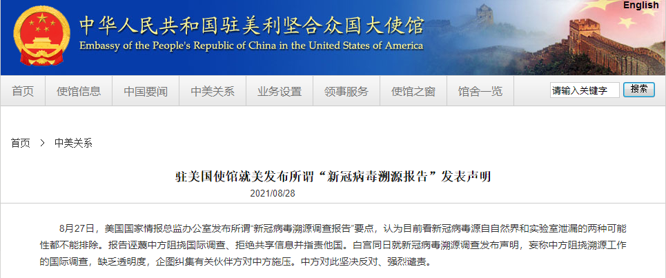 中国驻美国大使馆当天对此发表声明,指出美情报部门提供的报告没有给出美方想要的确切答案,再搞下去也是竹篮打水一场空。