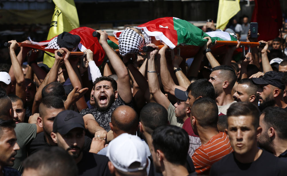 8月16日,巴勒斯坦民众在杰宁参加两名死者的葬礼。据当地媒体报道,以色列士兵当天在巴勒斯坦北部城市杰宁与巴勒斯坦人发生冲突,导致4名巴勒斯坦人死亡。(新华社发,艾曼·诺巴尼摄)