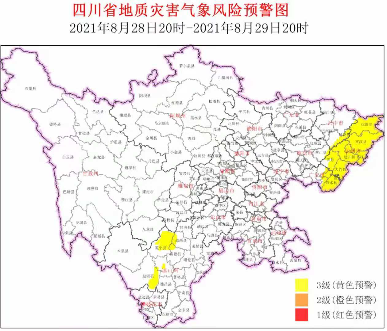 3级黄色预警区域为达州通川区、达川区、万源市、宣汉县、开江县、渠县、大竹县,巴中通江县、平昌县,广安市广安区、前锋区、华蓥市、邻水县,南充营山县,凉山州西昌市、盐源县、喜德县、冕宁县、越西县等5市(州)19个县(市、区)。