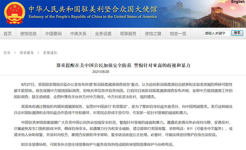 中国驻美使馆郑重提醒广大在美中国公民务必加强安全防范,警惕针对亚裔的歧视和暴力。遭遇此类情况务必保持冷静,妥善应对,尽量避免发生口角和肢体冲突,确保自身安全。如遇暴力行为和安全威胁,请立即拨打美国报警、求助电话:911(可要求中文服务),或请求他人协助报警,并及时向校方、雇佣方反映和寻求帮助,要求依法依规公正处理。必要时,可循法律途径维护自身合法权益。