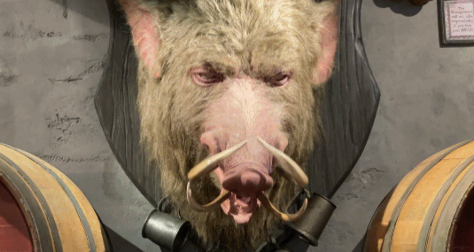 总台记者 罗子瑛:还有一个猪头酒吧,猪头是会动的,可以跟我们进行交流,在这里我们还可以要一杯巫师们都爱喝的黄油啤酒。