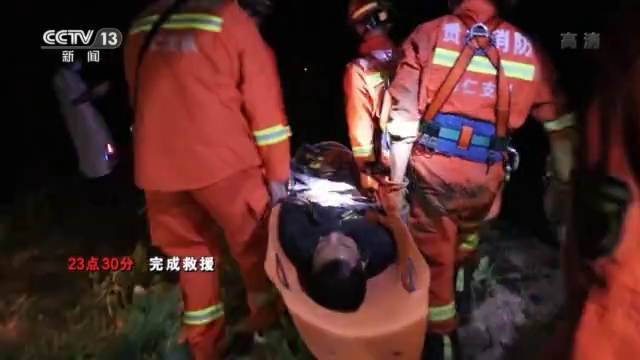 成功抵达底部后,尽管斜坡与被困者所处位置几乎垂直,搜救队也只能将被困人员固定在多功能担架上,通过两条保护绳的作用,一点点将伤者往上挪升,通过洞里洞外的配合实施救援。