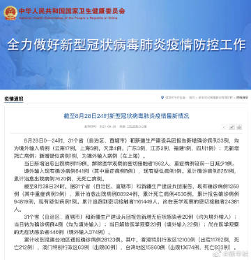 截至8月28日24时,据31个省(自治区、直辖市)和新疆生产建设兵团报告,现有确诊病例1259例(其中重症病例9例),累计治愈出院病例88924例,累计死亡病例4636例,累计报告确诊病例94819例,现有疑似病例1例。累计追踪到密切接触者1161449人,尚在医学观察的密切接触者24381人。
