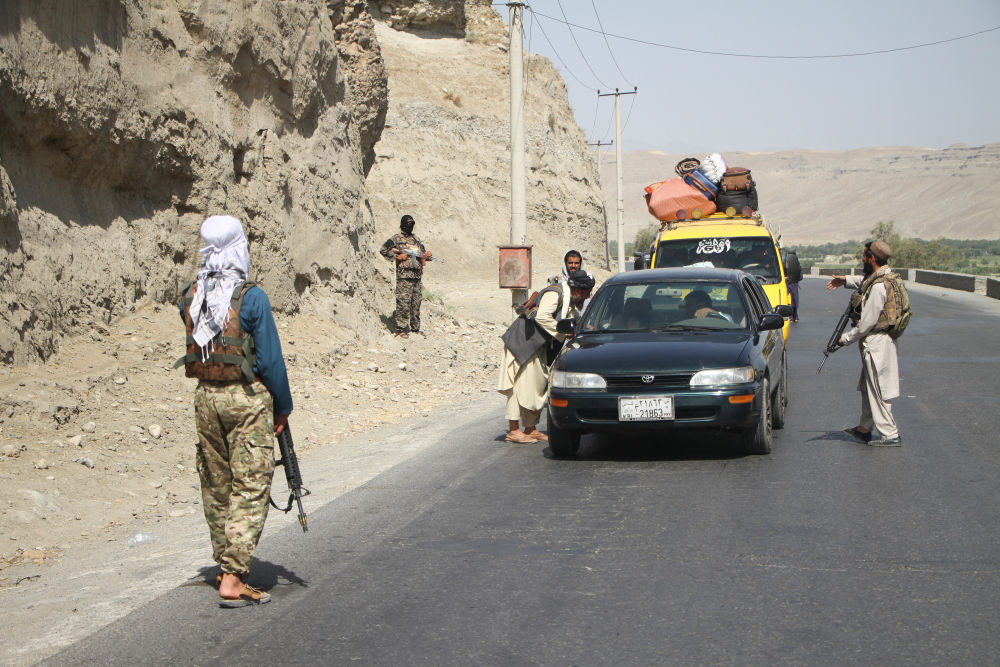 8月20日,阿富汗塔利班武装人员在喀布尔街头一处检查点检查过往车辆。(新华社发,塞夫拉赫曼·萨菲 摄)