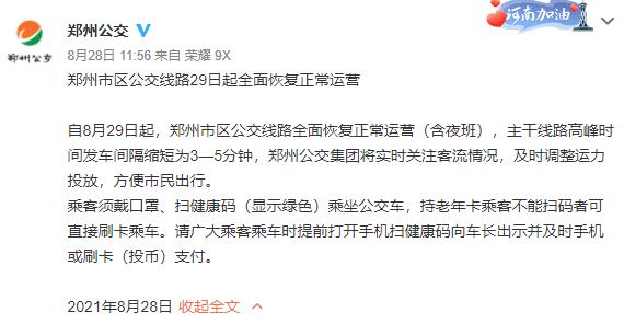 央视网消息:据@郑州公交 消息,自8月29日起,郑州市区公交线路全面恢复正常运营(含夜班),主干线路高峰时间发车间隔缩短为3—5分钟,郑州公交集团将实时关注客流情况,及时调整运力投放,方便市民出行。乘客须戴口罩、扫健康码(显示绿色)乘坐公交车,持老年卡乘客不能扫码者可直接刷卡乘车。请广大乘客乘车时提前打开手机扫健康码向车长出示并及时手机或刷卡(投币)支付。
