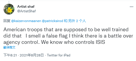 也有网友怀疑此次袭击事件可能有美国军队参与其中:“我认为这是一场围绕(阿富汗)机构控制权的争斗,本应接受过良好训练的美国军队却让我闻到了虚假的味道, 我们知道是谁控制着‘伊斯兰国’(ISIS)。”(总台记者 米春泽)