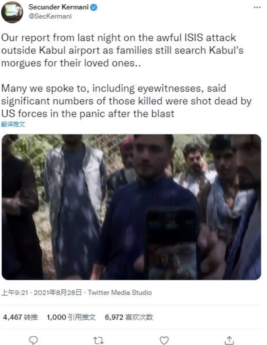 8月28日,中央广播电视总台报道员经向部分遇难者家属核实并综合阿富汗多家媒体消息,当地时间26日下午发生在阿富汗喀布尔国际机场的袭击事件中,部分遇难者是在袭击发生后的混乱中被美军等射杀。