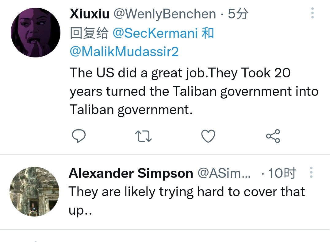 有网友评论道:“替美国(军队)感到羞耻,这太可怕了!”“美国政府好样的,成功地把阿富汗政权从塔利班换成了塔利班。”