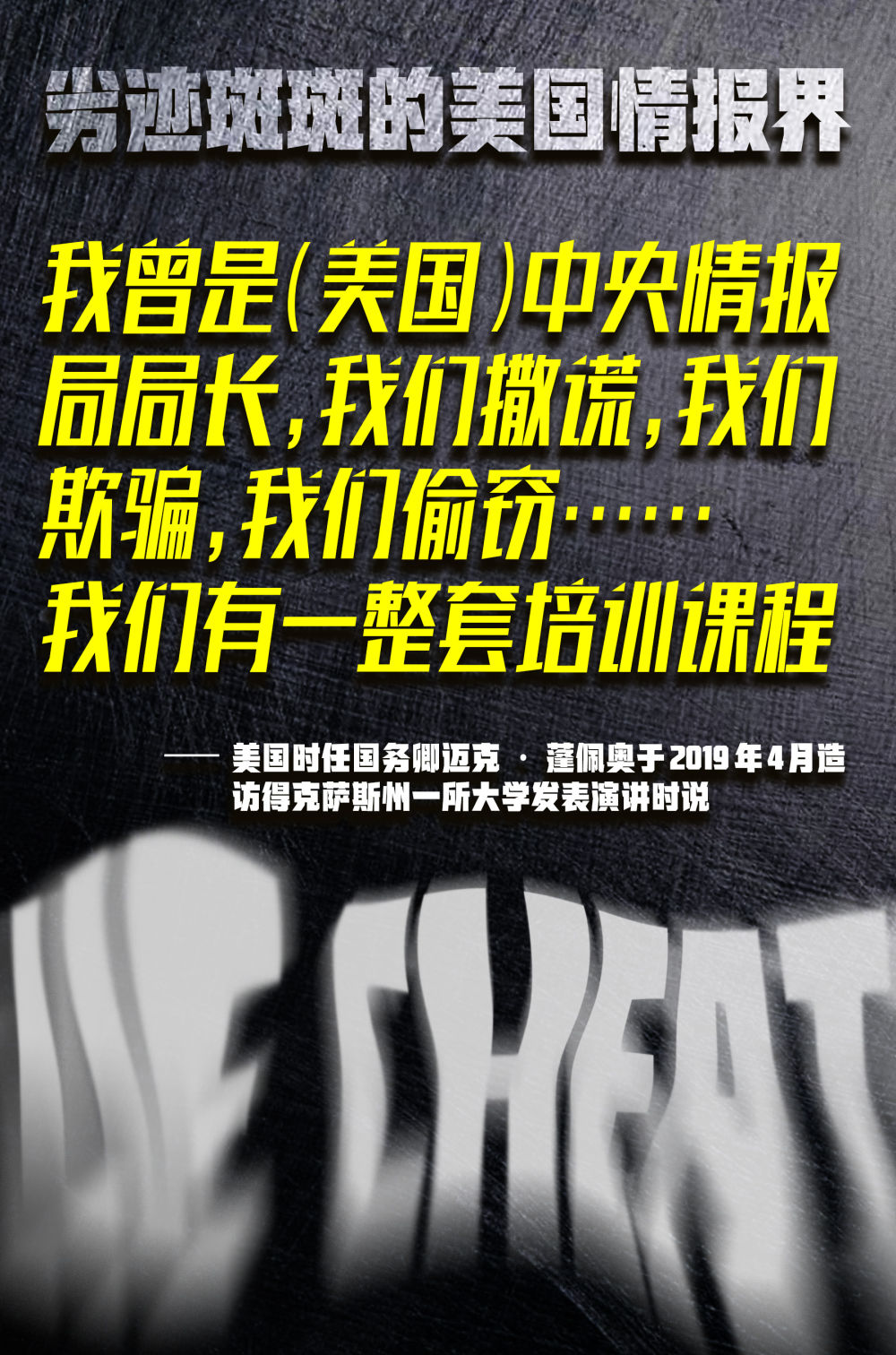 其实,美国前国务卿迈克·蓬佩奥引以为豪的这些卑鄙伎俩与美国情报界真实的所作所为相比,只能算是冰山一角。从编造假情报为美国入侵他国提供借口,到组织实施刺杀、虐囚、监听等见不得光的恶行,美国情报界的罪恶罄竹难书。