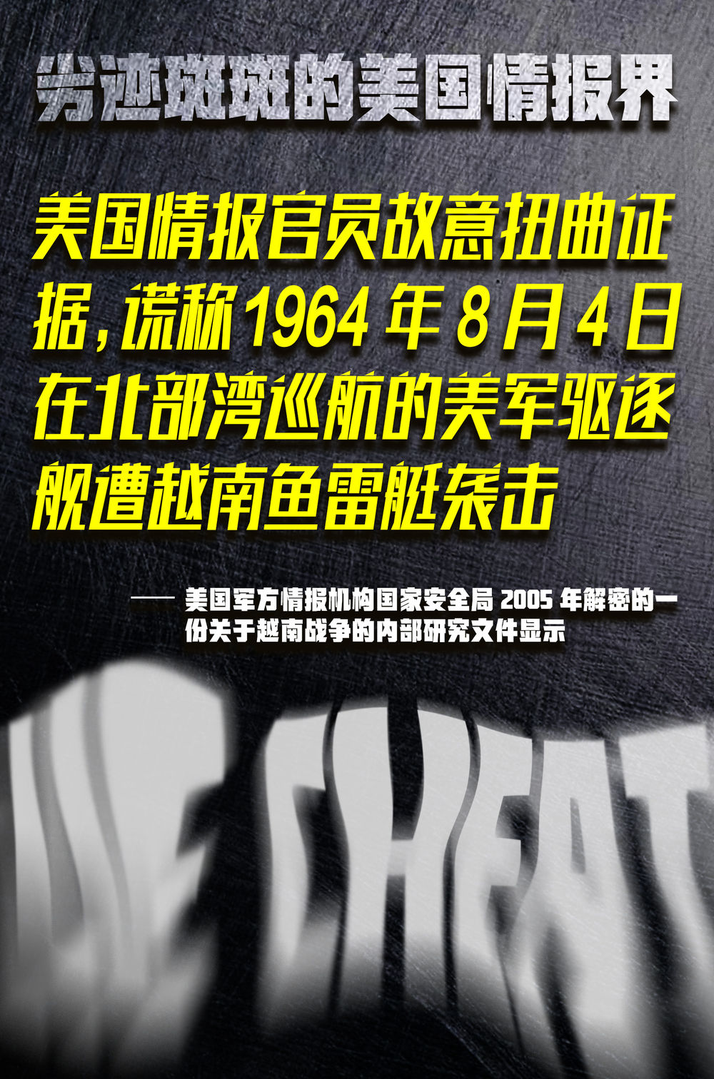 美国国家安全局2005年解密的一份关于越南战争的研究报告显示,有情报官员故意扭曲证据,谎称1964年8月4日在北部湾巡航的美军驱逐舰遭到越南鱼雷艇袭击。时任美国总统林登·约翰逊随后下令对越南北部进行轰炸,“北部湾事件”成为美国对越南战争升级的导火索。