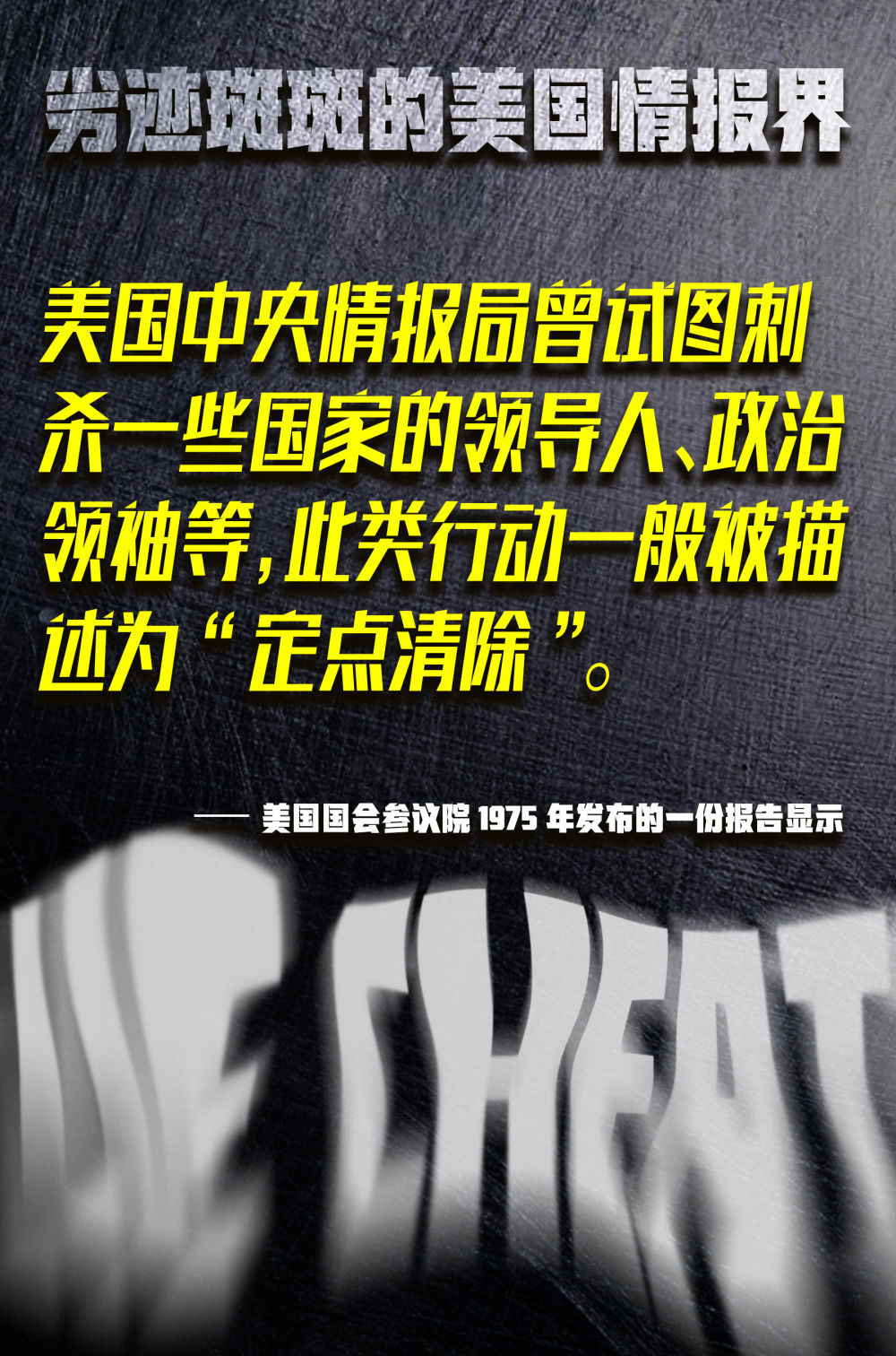 暗杀——根据美国国会参议院发布的报告,中情局曾试图暗杀古巴等国领导人,还曾协助在智利、越南等国的暗杀行动。尽管美国此后出台了暗杀禁令,但英国《卫报》网站刊文指出,美国实际上从未彻底放弃这种恐怖主义手段,只是把“暗杀”一词改为“定点清除”。过去几十年,在情报部门支持下,美军频繁使用空袭方式清除海外目标人物,由此还造成大量平民伤亡。