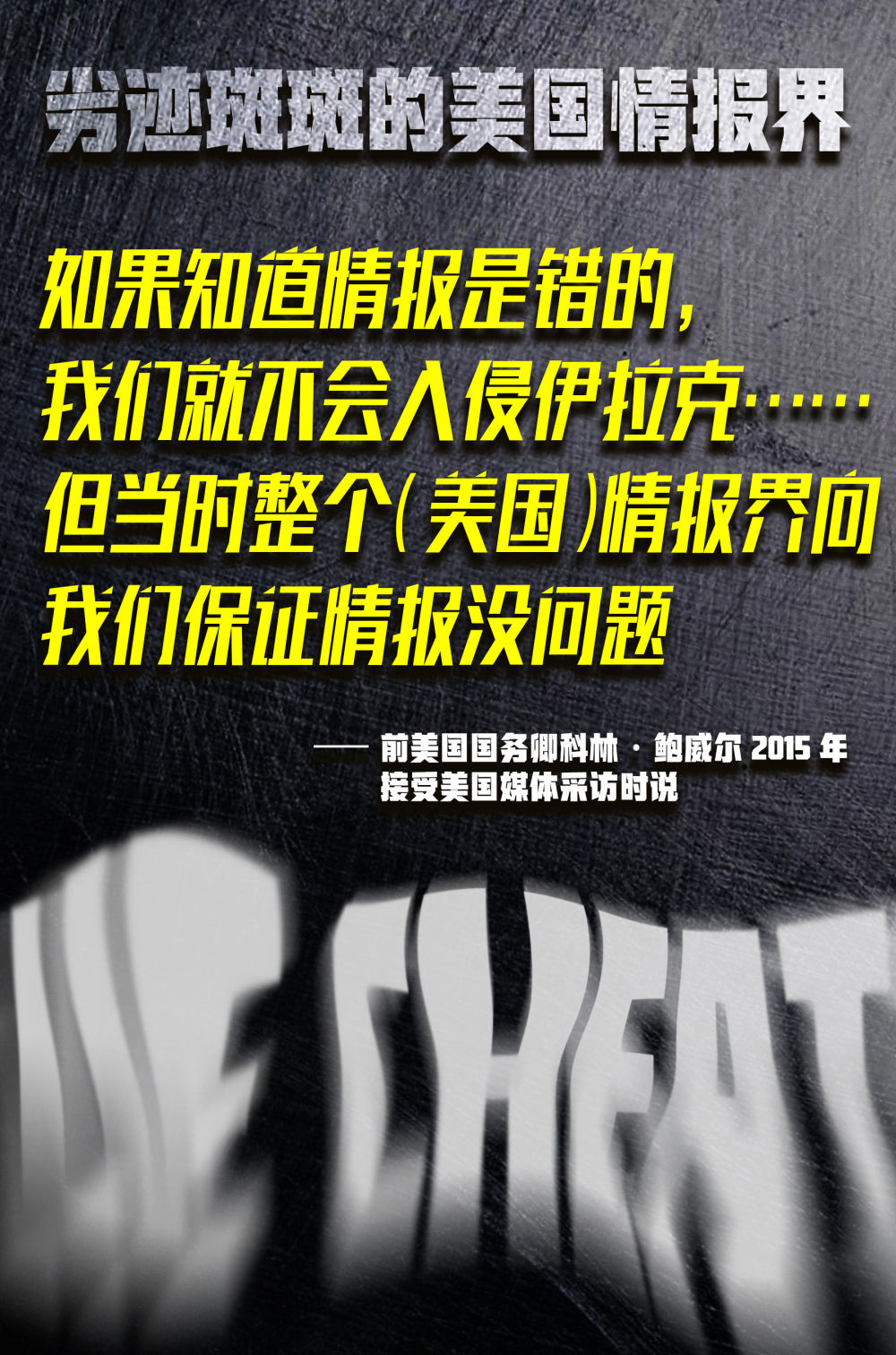 一个广为人知的案例就是,美国曾宣称有“可靠情报”证明伊拉克拥有大规模杀伤性武器,并以此为由于2003年入侵伊拉克,但最终也没有找到确凿证据。当年在联合国安理会会议上,时任美国国务卿科林·鲍威尔拿着装有所谓“化学武器”粉末的试管来证明对伊动武的必要性,这一“经典画面”沦为全世界的笑柄。