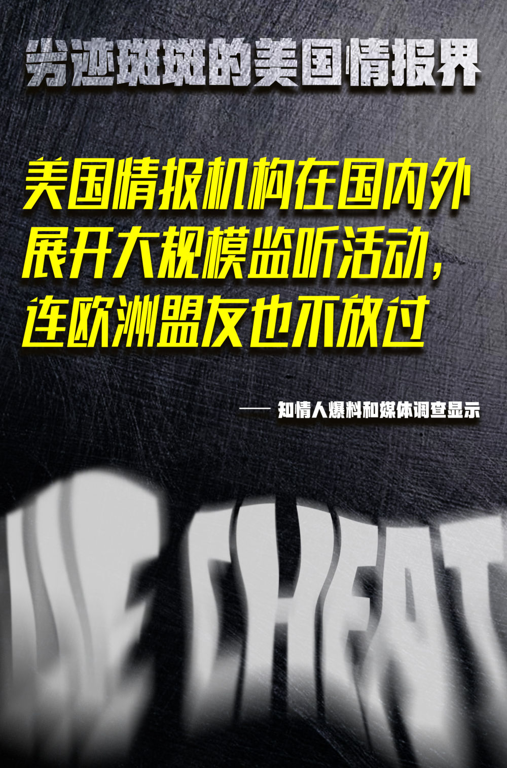 监听——美国情报机构以“国家安全”为名大搞监听活动,利用网络优势和黑客技术把触角伸向全球。今年5月,美国国家安全局被曝利用丹麦互联网设施监听一些欧洲盟国领导人,再次引发轩然大波。早在2013年,美国前防务承包商雇员爱德华·斯诺登就揭露了美国情报部门广泛监听国内外电话及互联网通信的行为。由此可见,美国情报界在这方面丝毫没有收敛,就算对盟友也未手下留情。