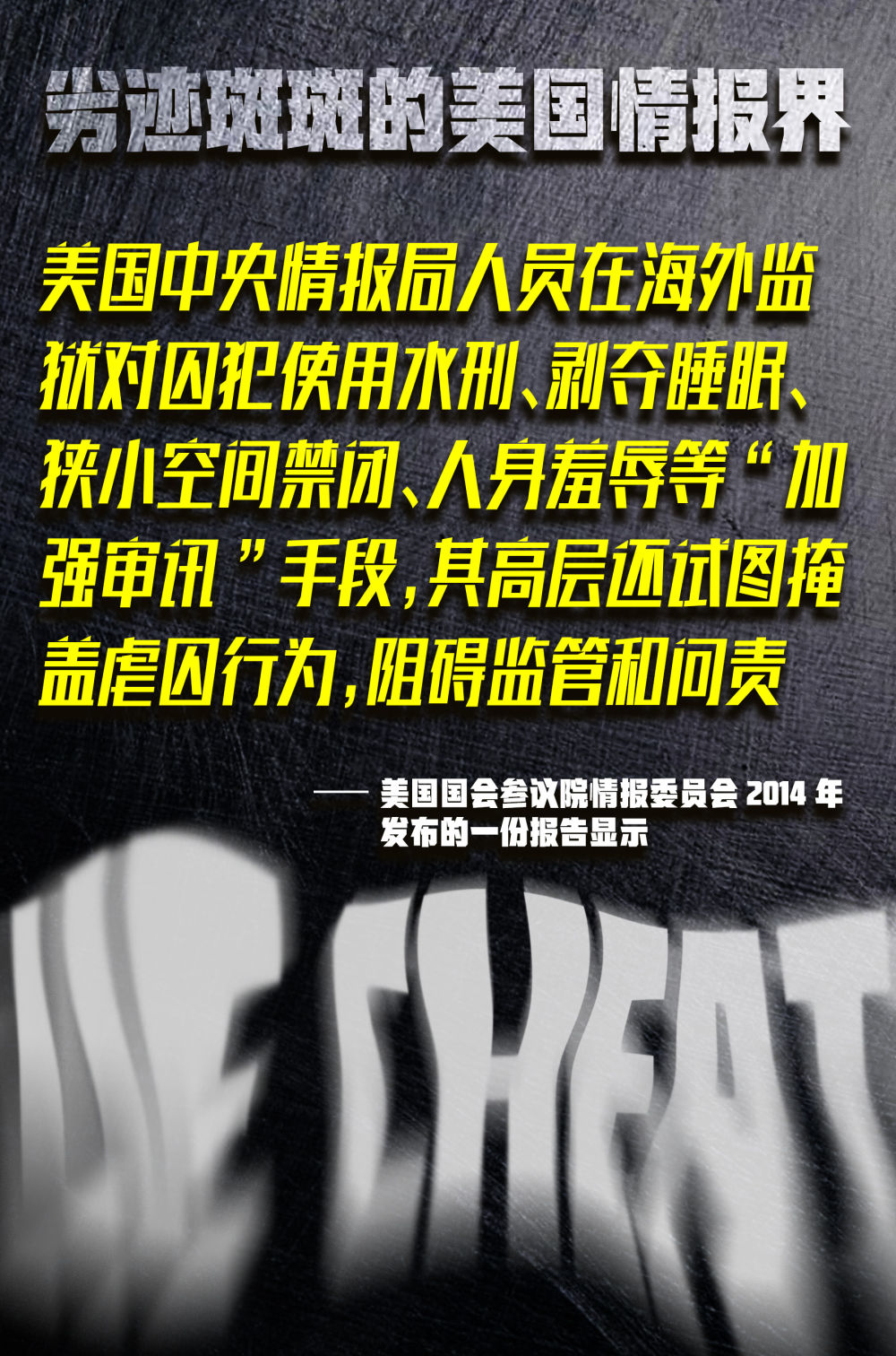 虐囚——美国国会参议院情报委员会2014年曾发布报告,详细描述了中情局在审讯囚犯时如何刑讯逼供,其使用的“加强审讯”手段包括水刑、剥夺睡眠、狭小空间禁闭、人身羞辱等。报告还指出,中情局试图掩盖虐囚行为并妨碍监管。该委员会时任主席黛安娜·范斯坦直言:中情局的行为是美国历史上的一个污点。