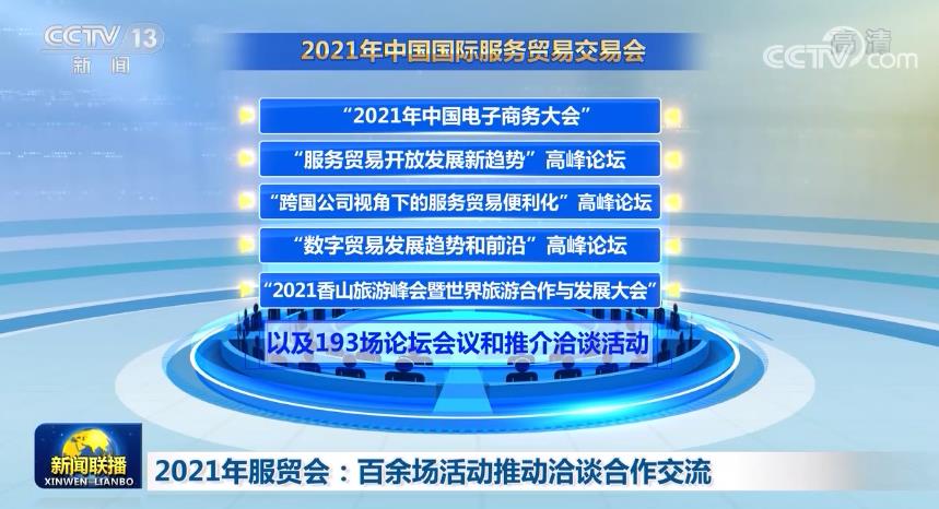 央视网消息(新闻联播):2021年中国国际服务贸易交易会将于9月2日在北京开幕,目前,本届服贸会论坛会议活动已经基本确定,共将举办“2021年中国电子商务大会”“服务贸易开放发展新趋势”高峰论坛等5场高峰论坛以及193场论坛会议和推介洽谈活动。来自全球的180多位境内外重要嘉宾将线上或线下参会,围绕服务贸易高质量发展、开放合作、数字新生态、振兴世界旅游等开展交流,对全球服务贸易战略性、结构性问题进行深入研讨。