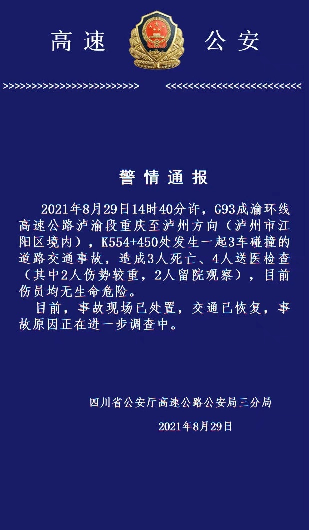 8月29日晚,四川省高速交警三支队发布警情通报,2021年8月29日14时40分许,G93成渝环线高速公路泸渝段重庆至泸州方向(泸州市江阳区境内),K554+450处发生一起3车碰撞的道路交通事故,造成3人死亡、4人送医检查(其中2人伤势较重,2人留院观察),目前伤员均无生命危险。目前,事故现场已处置,交通已恢复,事故原因正在进一步调查中。(总台记者 黄鹂)