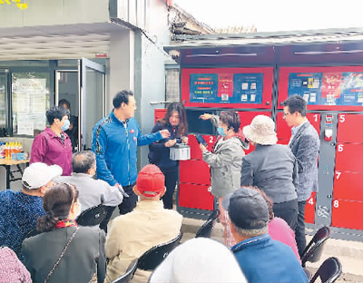 工作人员在北京市东城区景山街道给居民讲解电动车智能充电柜使用方法。