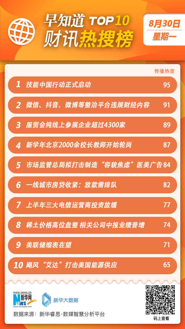 【早知道·财讯热搜榜TOP10】运用新华睿思大数据平台,从各媒体信源数据抓取最近24小时财经新闻、事件、话题传播热度排行。