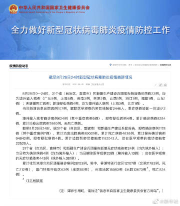 截至8月29日24时,据31个省(自治区、直辖市)和新疆生产建设兵团报告,现有确诊病例1175例(其中重症病例7例),累计治愈出院病例89031例,累计死亡病例4636例,累计报告确诊病例94842例,现有疑似病例4例。累计追踪到密切接触者1162043人,尚在医学观察的密切接触者22529人。
