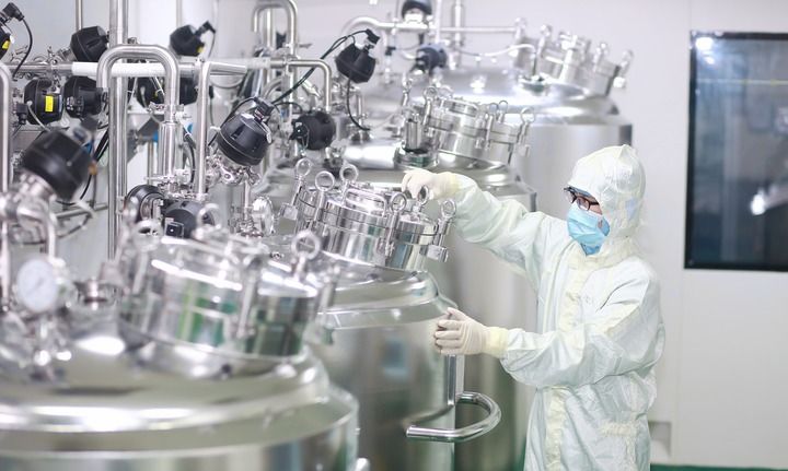 研发人员在丽珠生物的新冠疫苗试生产车间工作。(丽珠生物供图)新华社发