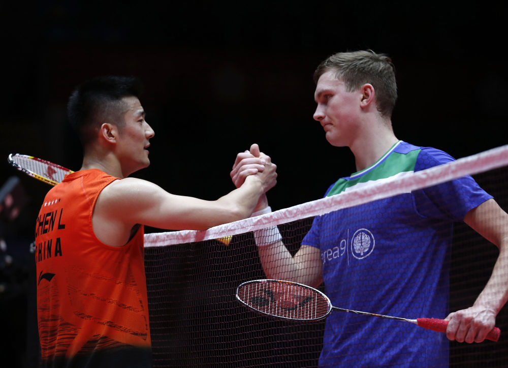 8月2日,丹麦选手安赛龙(左)与中国选手谌龙赛后致意。新华社记者薛玉斌摄