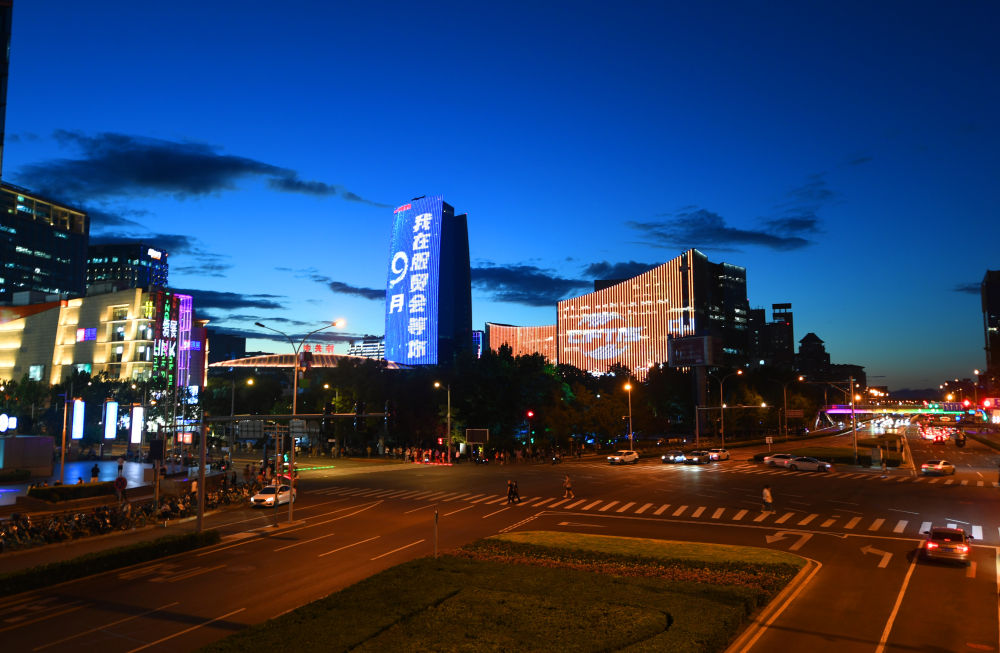 这是8月1日在北京市海淀区中关村大街拍摄的2021年服贸会户外灯光展示。(新华社记者任超摄)