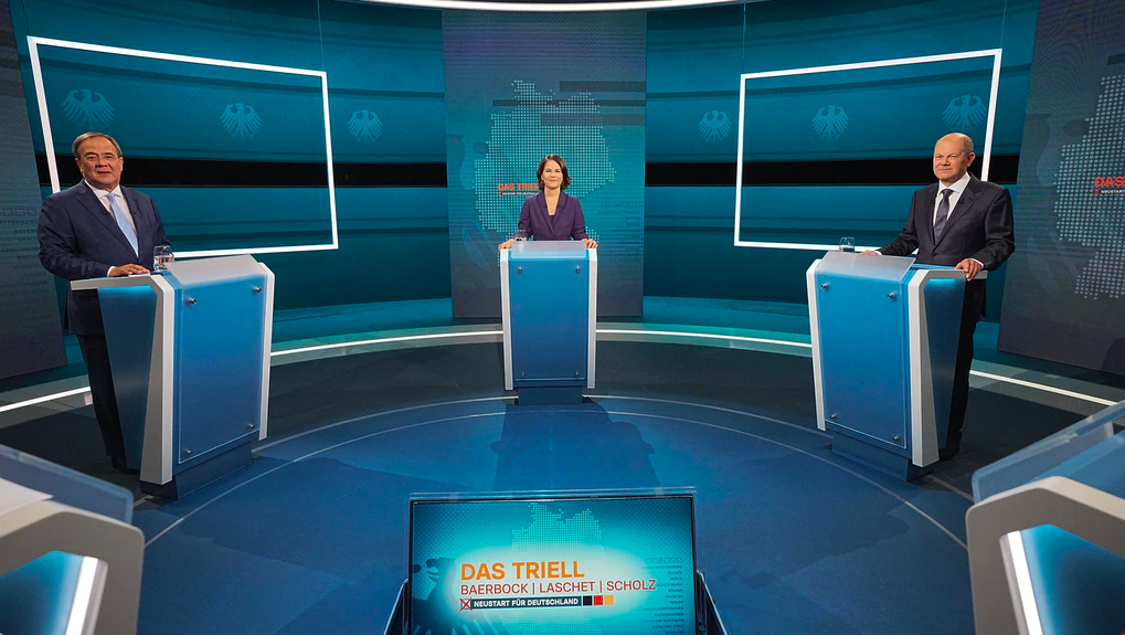 △德国三位总理候选人8月29日晚进行首次电视辩论,从左至右:拉舍特、贝尔伯克、肖尔茨(图片来源:德新社)