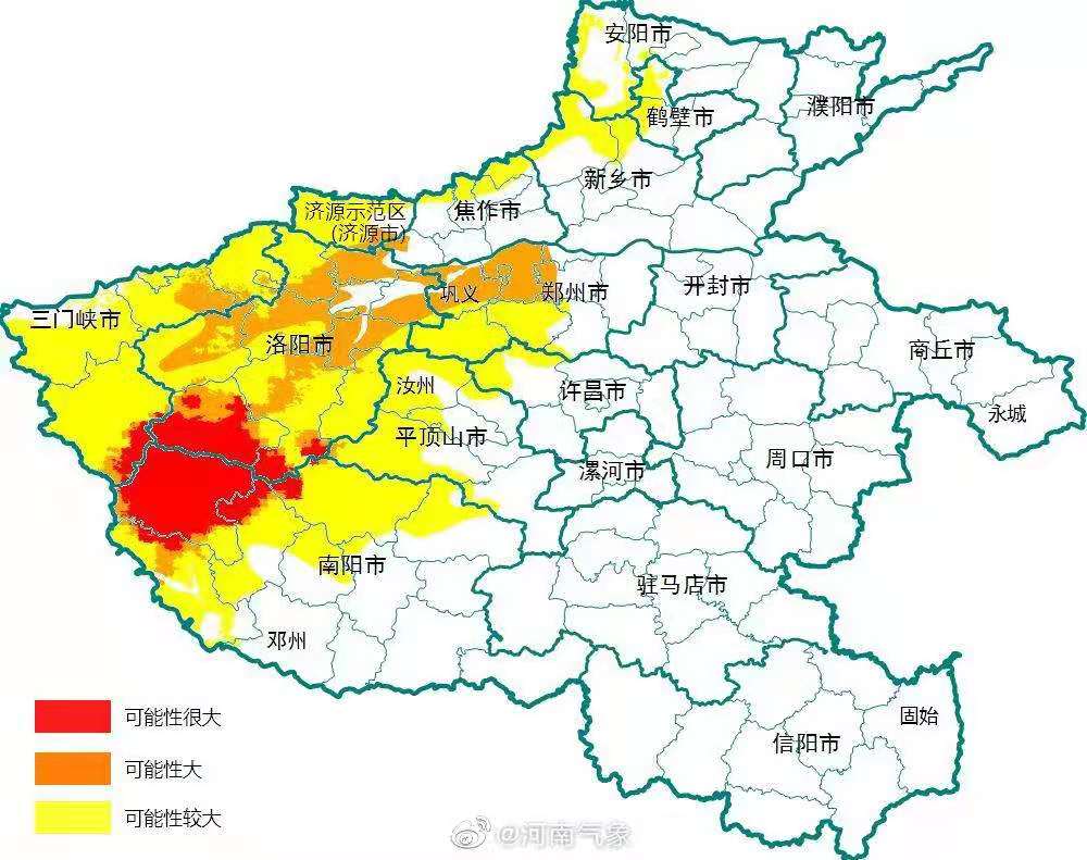 达到橙色预警的地区为洛阳大部,郑州西北部,三门峡东北部及南部,济源南部,南阳西部及北部,焦作、平顶山西部,巩义大部,发生地质灾害的可能性大。