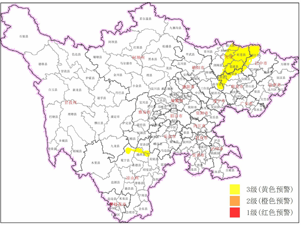预警区域为广元利州区、朝天区、昭化区、旺苍县、剑阁县、苍溪县,绵阳盐亭县,巴中恩阳区、南江县,南充阆中市、南部县、仪陇县、西充县,凉山州冕宁县、越西县、甘洛县、美姑县等5市(州)17个县(市、区)。