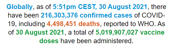 根据世卫组织最新实时统计数据,截至欧洲中部夏令时间8月30日17时51分(北京时间8月30日23时51分),全球累计新冠肺炎确诊病例216303376例,累计死亡病例4498451例。30日全球新冠肺炎确诊病例新增588552例,死亡病例新增7698例。(总台记者 朱赫)