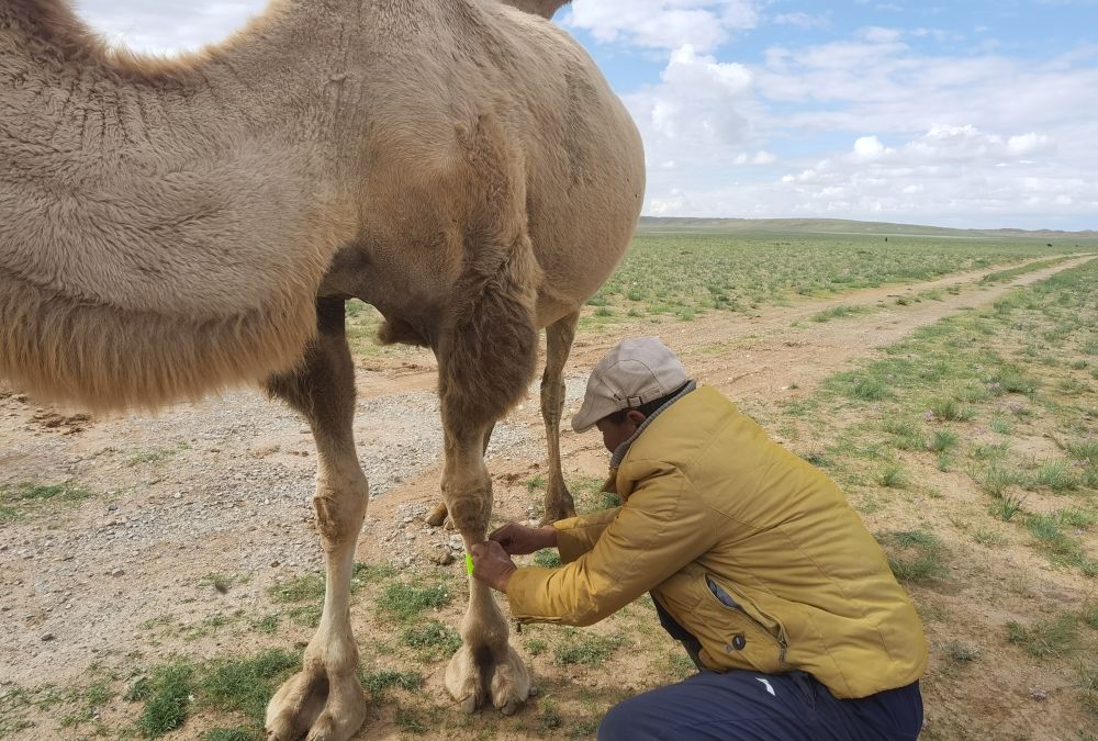 牧民为骆驼戴上反光腿带。受访者供图