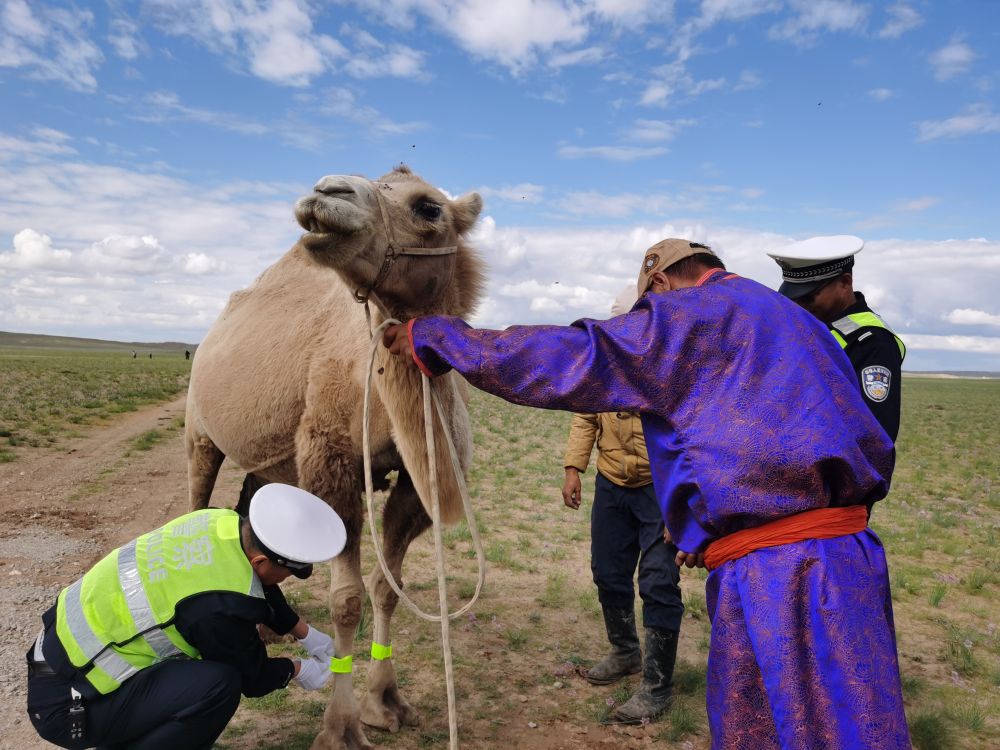 新华社呼和浩特8月31日电(记者哈丽娜)清晨,内蒙古自治区乌拉特中旗交管大队民警给牧民宝日夫送来了100多条反光腿带,并帮助他系在骆驼四条腿上。