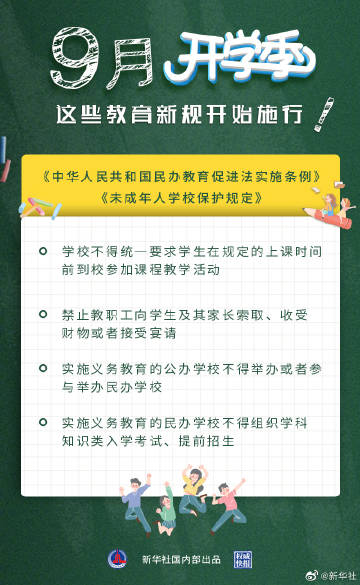 【权威快报|开学季,#两个教育新规9月1日起施行#】新修订的《中华人民共和国民办教育促进法实施条例》规定,民办学校要坚持公益性原则,明确实施学前教育、学历教育的民办学校享有与同级同类公办学校同等的招生权,对民办学校的组织与活动进行规范。《未成年人学校保护规定》要求,学校建立对学生欺凌、性侵害、性骚扰行为的零容忍机制,#学校不得公开学生的考试成绩等学业信息#,禁止义务教育学校占用寒暑假等时段组织学生集体补课。(记者白阳,海报设计张晨光)