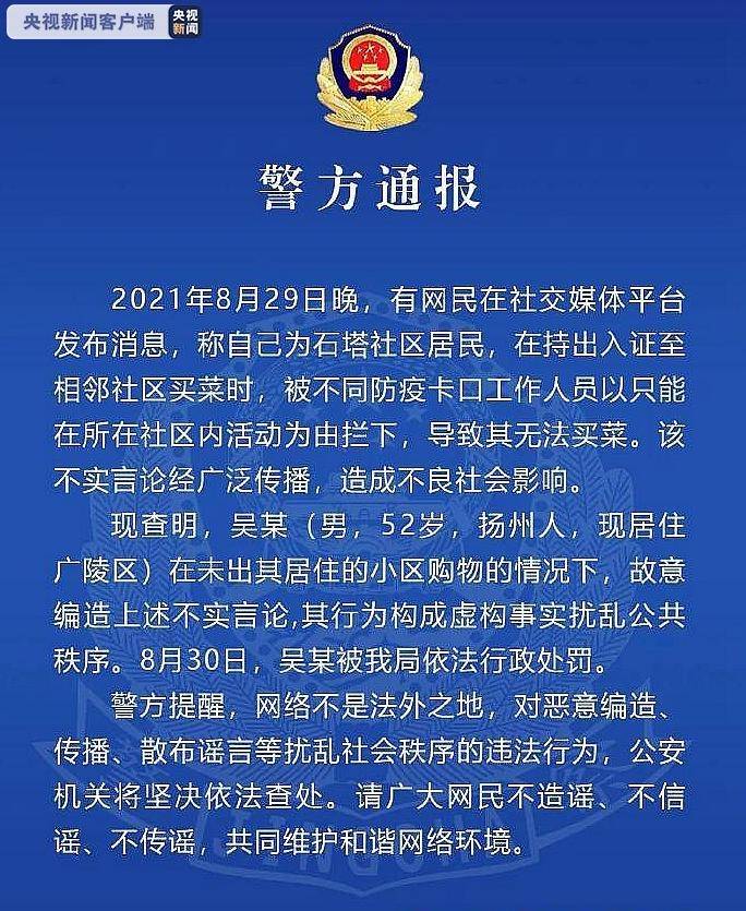 记者从相关部门获悉,扬州市公安局广陵分局通报:2021年8月29日晚,有网民在社交媒体平台发布消息,称自己为石塔社区居民,在持出入证至相邻社区买菜时,被不同防疫卡口工作人员以只能在所在社区内活动为由拦下,导致其无法买菜。该不实言论经广泛传播,造成不良社会影响。