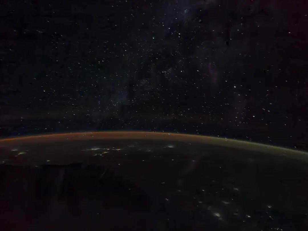 2021年8月8日,北京时间早上6点32分,核心舱组合体划过埃塞俄比亚高原上空,星星点点的夜空下,渲染了阳光斑斓的大气层温柔地拥抱着这个美丽的蓝色星球,远处索马里半岛的轮廓正指向阳光的方向。