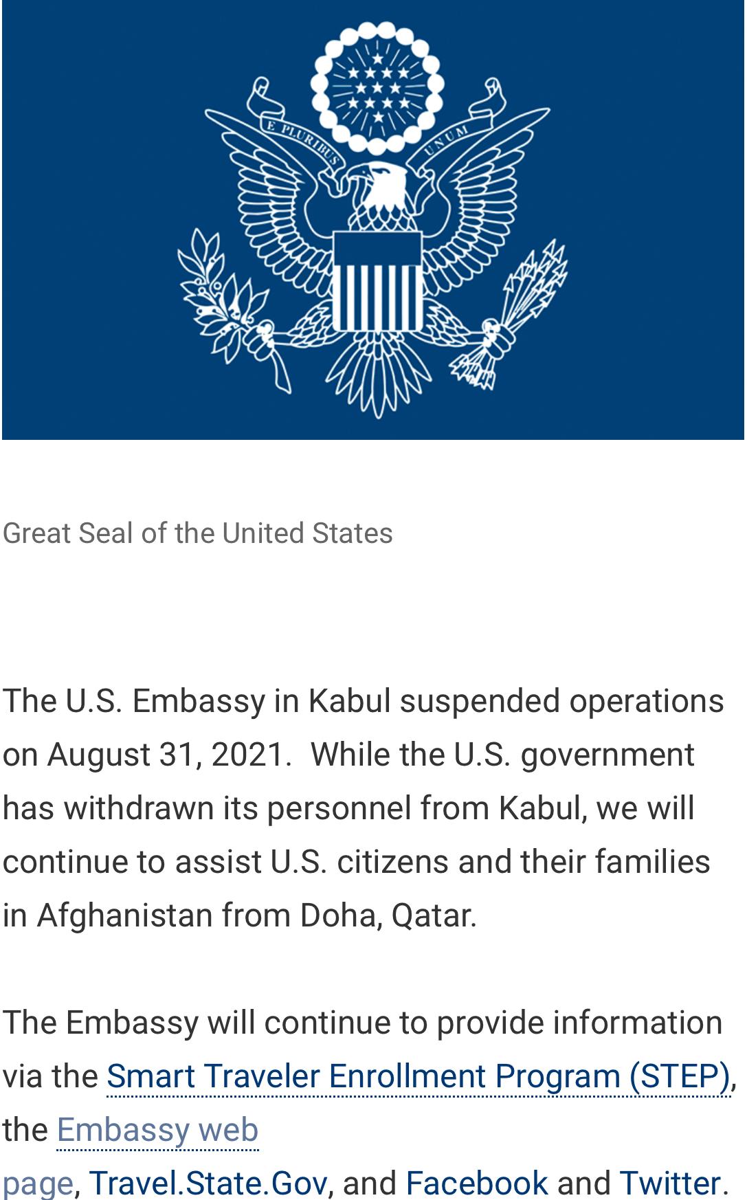美国驻阿富汗大使馆当地时间8月31日上午发布通告,宣布即日起暂停运作。