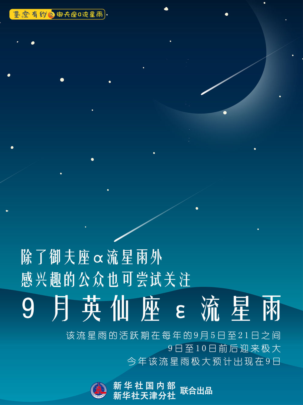 除了御夫座α流星雨之外,感兴趣的公众也可以尝试关注一下9月英仙座ε流星雨。该流星雨的活跃期在每年的9月5日至21日之间,极大时间主要集中在9日和10日。今年,该流星雨极大预计出现在9月9日。