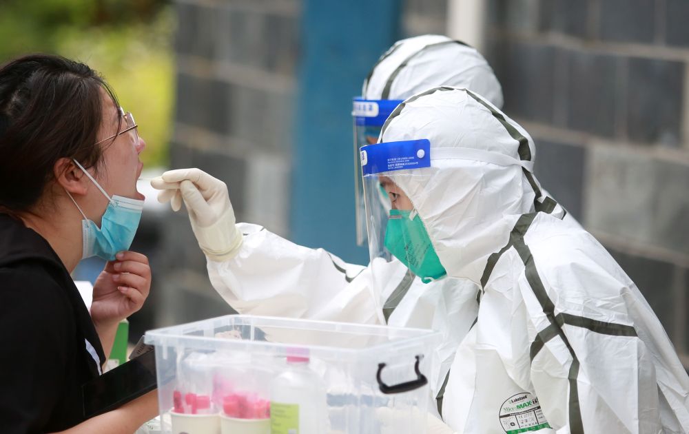 8月19日,在江苏省扬州市邗江区竹西街道竹西社区核酸检测点,医务人员为居民进行核酸检测采样。(新华社发,孟德龙摄)