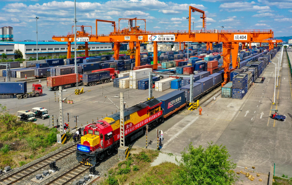 4月26日拍摄的从成都国际铁路港发出的开往英国费利克斯托的中欧班列(无人机照片)。(新华社发)
