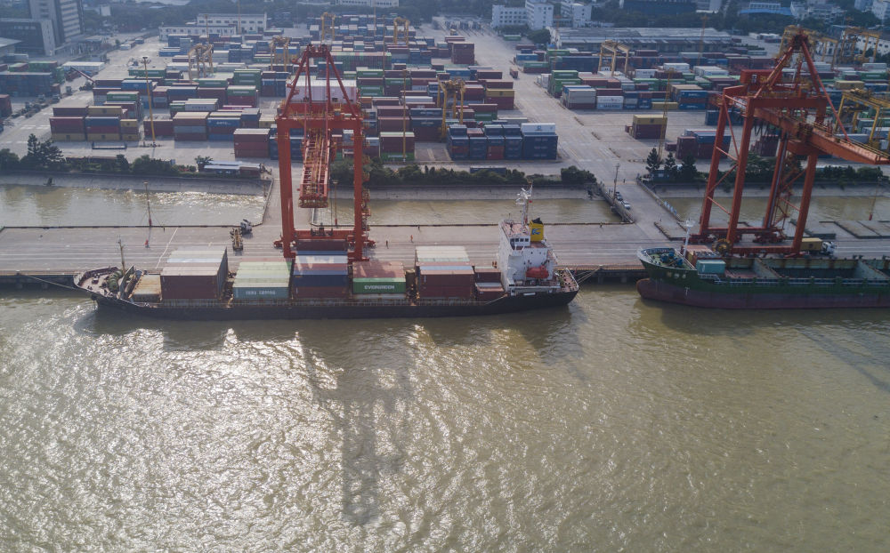 6月3日,集装箱货轮停靠在中国(福建)自由贸易试验区福州青州集装箱码头(无人机照片)。(新华社记者宋为伟摄)