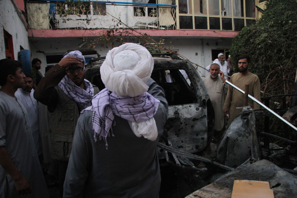 8月29日,在阿富汗首都喀布尔国际机场附近居民区,人们查看火箭弹袭击现场。新华社发(塞夫拉赫曼·萨菲摄)