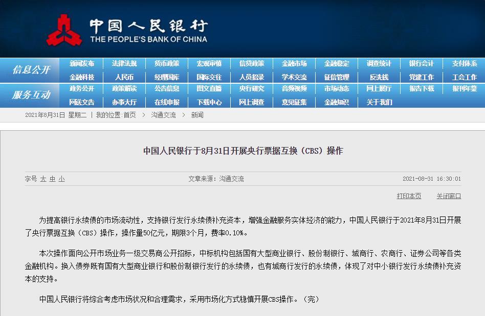 为提高银行永续债的市场流动性,支持银行发行永续债补充资本,增强金融服务实体经济的能力,中国人民银行于2021年8月31日开展了央行票据互换(CBS)操作,操作量50亿元,期限3个月,费率0.10%。