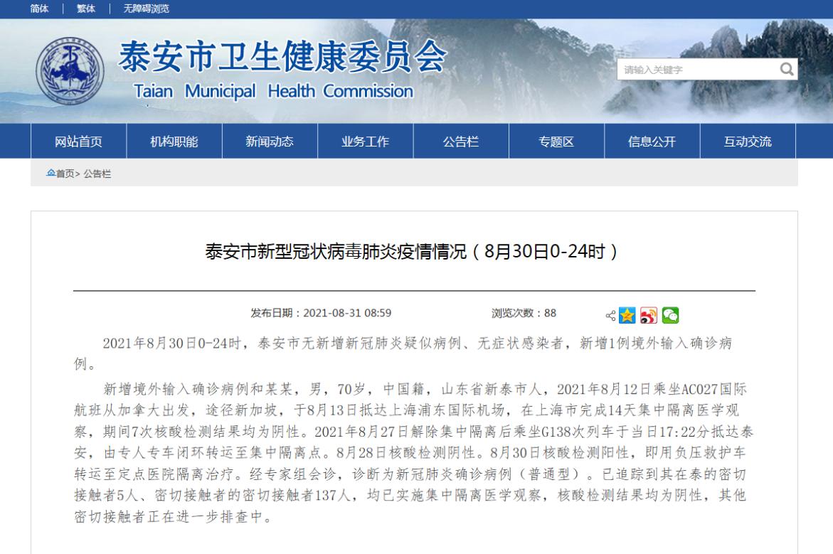 31日,据山东省泰安市卫生健康委员会官方网站消息,2021年8月30日0—24时,泰安市无新增新冠肺炎疑似病例、无症状感染者,新增1例境外输入确诊病例。