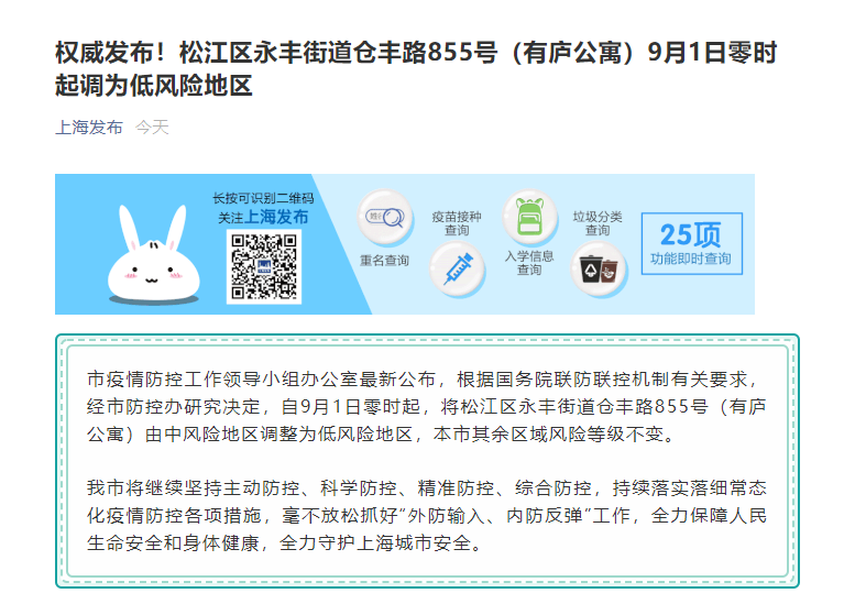 31日,记者获悉,上海市疫情防控工作领导小组办公室最新公布,根据国务院联防联控机制有关要求,经上海市防控办研究决定,自9月1日0时起,将松江区永丰街道仓丰路855号(有庐公寓)由中风险地区调整为低风险地区,上海市其余区域风险等级不变。