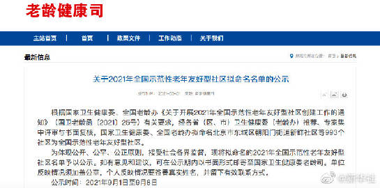 【#首批全国示范性老年友好型社区#来了!】国家卫生健康委官网31日发布公示,根据国家卫生健康委、全国老龄办《关于开展2021年全国示范性老年友好型社区创建工作的通知》有关要求,经各省(区、市)卫生健康委(老龄办)推荐、专家集中评审与书面复核,国家卫生健康委、全国老龄办拟命名北京市东城区朝阳门街道新鲜社区等993个社区为全国示范性老年友好型社区。公示时间为2021年9月1日至9月8日。(记者田晓航)