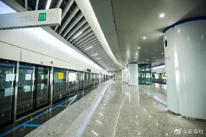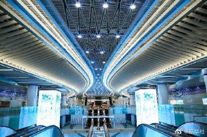【#粤港澳大湾区最快地铁线全部车站已移交运营调试#】广州地铁18号线、22号线是粤港澳大湾区时速最快的地铁线,时速达160公里。广州地铁集团8月31日介绍,目前这两条地铁线的首通段轨行区和全部车站已移交运营调试。除了时速最快,地铁车站也采用了全新的设计理念。“湾区蓝”的色彩质感、灵动飘逸的空间层次感,尽显“国际范”。(图为广州地铁18号线番禺广场站 广州地铁集团供图)