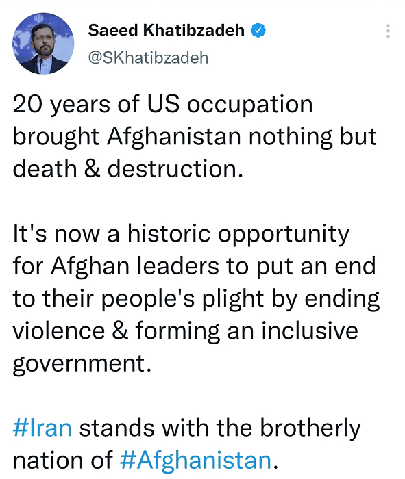 当地时间8月31日,伊朗外交部发言人哈提卜扎德在社交媒体上表示:“美国占领阿富汗的20年,给阿富汗带来的只有破坏和死亡。现在是阿富汗领导人通过结束暴力、组建包容性政府来带领人民摆脱困境的历史性机会。伊朗同兄弟般的国家阿富汗站在一起。”