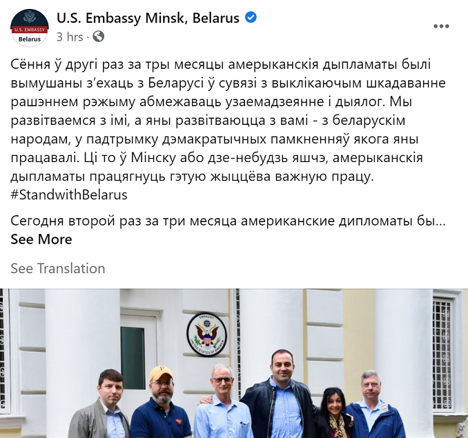美国驻白俄罗斯大使馆当天在其社交媒体账号上写道:“由于白方决定限制合作与对话,美国外交人员在近三个月以来第二次被迫离开白俄罗斯。”