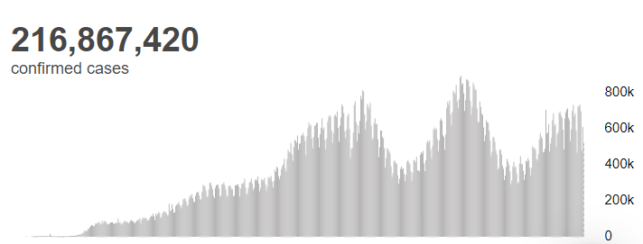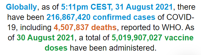 根据世卫组织最新实时统计数据,截至欧洲中部夏令时间8月31日17时11分(北京时间8月31日23时11分),全球累计新冠肺炎确诊病例216867420例,累计死亡病例4507837例。31日全球新冠肺炎确诊病例新增521035例,死亡病例新增8483例。(总台记者 朱赫)